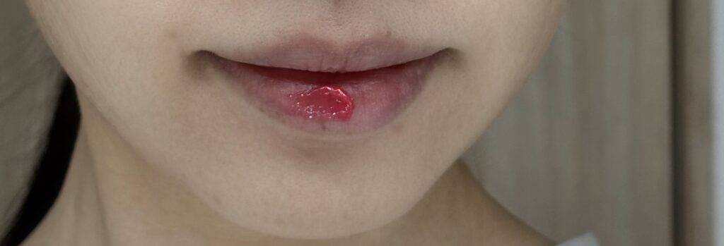 リップ用のスパチュラで少量とって唇に乗せ、馴染ませます。